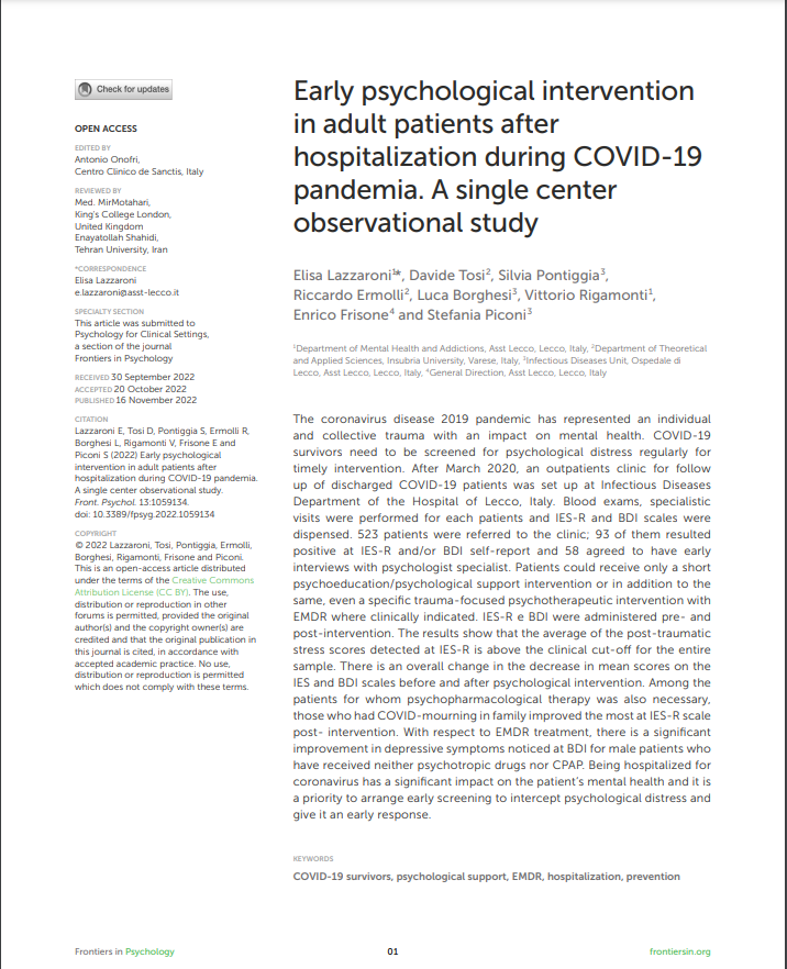 Lazzaroni E, Tosi D, Pontiggia S, Ermolli R, Borghesi L, Rigamonti V, Frisone E and Piconi S (2022);